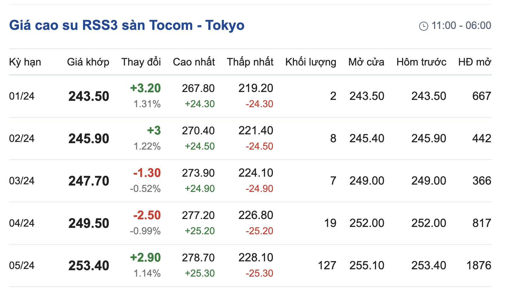 Tại Sở giao dịch hàng hóa Tokyo (TOCOM), giá cao su kỳ hạn giao tháng 1/2024 đạt mức 242,2 yen/kg, tăng 0,33% (tương đương 0,8 yen/kg) tại thời điểm khảo sát vào lúc 6h50 (giờ Việt Nam).
