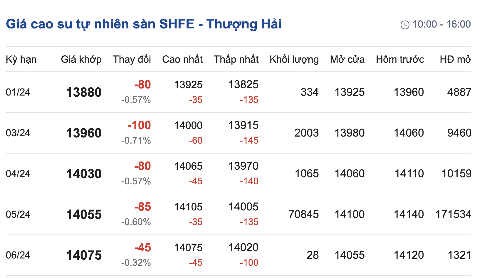 Trên Sàn giao dịch hàng hóa tương lai Thượng Hải (SHFE), giá cao su RSS3 giao kỳ hạn tháng 1/2024 được điều chỉnh lên mức 13.635 nhân dân tệ/tấn, tăng 1,41% (tương đương 190 nhân dân tệ) so với giao dịch.